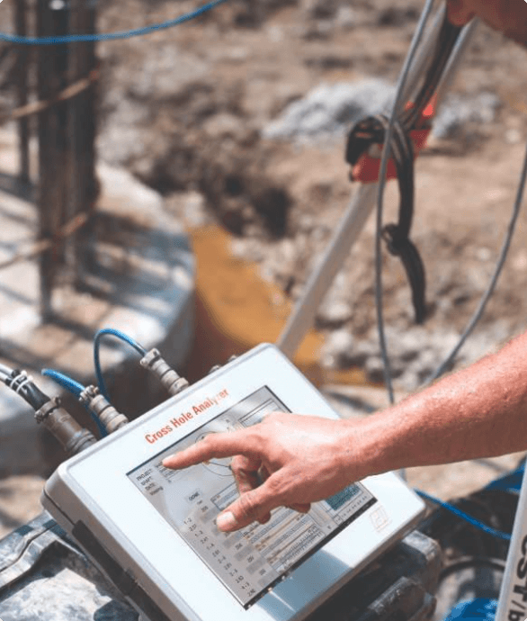 Testing is performed with a Cross-Hole Analyzer (CHA) manufactured by Pile Dynamics Inc. During the test a transmitter is lowered down one of the tubes and sends a high frequency signal to a receiver inserted in another tube. The transmitter and receiver move down each pair of tubes, scanning the entire length of the shaft for imperfections and voids in the concrete.